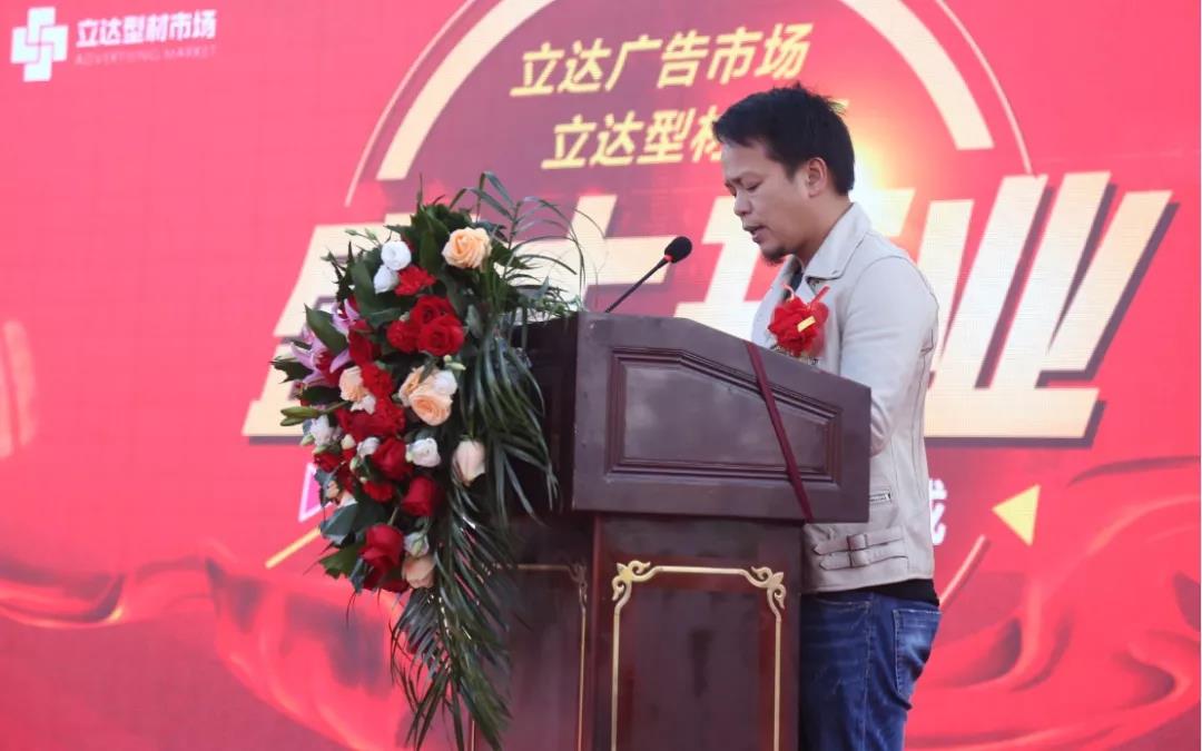 立達(dá)型材廣告市場商戶代表金港廣告標(biāo)識總經(jīng)理周圣飚先生致辭,周總回顧結(jié)緣立達(dá)及見證立達(dá)型材廣告市場的一路發(fā)展,同時他表示,在興慶區(qū)整治散亂污企業(yè)的背景下,立達(dá)為重振銀川商貿(mào)批發(fā)業(yè)所作出的貢獻(xiàn)與成績是有目共睹的。立達(dá)型材廣告市場為廣大經(jīng)營商戶提供了優(yōu)質(zhì)的發(fā)展平臺,他呼吁行業(yè)同仁緊抓當(dāng)前發(fā)展機(jī)遇,積極配合市場運(yùn)營,共同謀劃發(fā)展之路。與立達(dá)一道將市場打造成銀川地區(qū)規(guī)模最大、品類最全、運(yùn)營最規(guī)范、交易量最高的型材廣告專業(yè)市場。