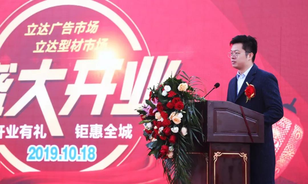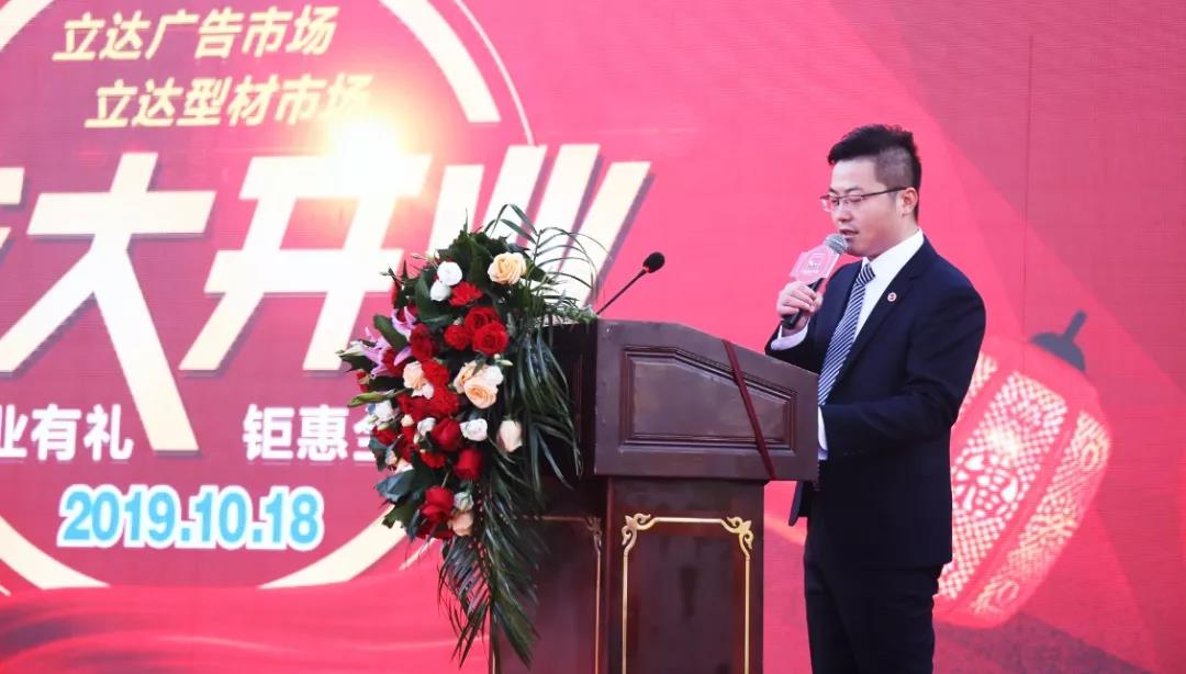 張凱總經(jīng)理首先對領(lǐng)導(dǎo)嘉賓的到來表示熱烈的歡迎,并對一路支持立達(dá)型材市場和廣告市場發(fā)展的社會各界表示感謝,他重點就立達(dá)型材廣告市場的設(shè)計開發(fā)、發(fā)展概況及發(fā)展思路做了介紹,他在致辭中提到,目前,型材市場已入駐商戶300多家,廣告市場入駐商戶150多家,物流中心入駐商戶20多家,市場入駐率達(dá)80%。鋁型材、門窗、不銹鋼加工生產(chǎn)及廣告制作、廣告噴繪、吸塑雕刻、LED顯示屏及大型物流配送中心等品類已達(dá)到了真正的專業(yè)化聚集。最后,張凱總經(jīng)理勉勵廣大商戶共同努力,共做市場,為繁榮銀川商貿(mào)行業(yè),促進(jìn)市場繁榮貢獻(xiàn)力量。