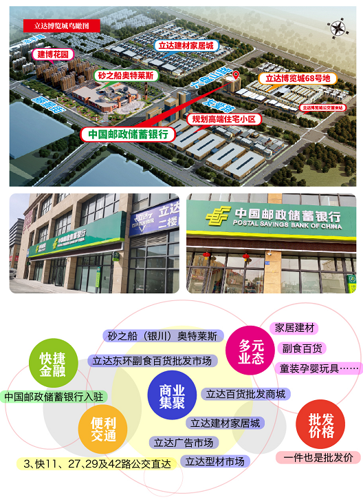 立達(dá)博覽城位于銀川市友愛(ài)新商圈核心位置,項(xiàng)目東至燕慶路,西至麗景南街,南至規(guī)劃路,北至治平路,緊鄰銀川環(huán)城高速、京藏高速及銀古物流中心,地理位置優(yōu)越、交通路網(wǎng)便捷高效。項(xiàng)目總占地1000畝,囊括立達(dá)建材家居城、立達(dá)東環(huán)副食品批發(fā)市場(chǎng)、立達(dá)百貨批發(fā)商城、立達(dá)廣告市場(chǎng)、立達(dá)型材市場(chǎng)、砂之船奧特萊斯(建設(shè)中)奧萊花苑(精品住宅項(xiàng)目,火熱預(yù)定中)。集展示、銷(xiāo)售、倉(cāng)儲(chǔ)、物流、商業(yè)配套、住宅為一體。商業(yè)涵蓋建材、家居、副食、百貨日雜、童裝 、孕嬰玩具、調(diào)料調(diào)味、酒水 、飲料、 糖果、 一次性用品、干果特產(chǎn)、茶葉、辦公文具等,品類(lèi)齊全,實(shí)力商戶(hù)聚集,質(zhì)優(yōu)價(jià)廉,批零兼營(yíng)。
